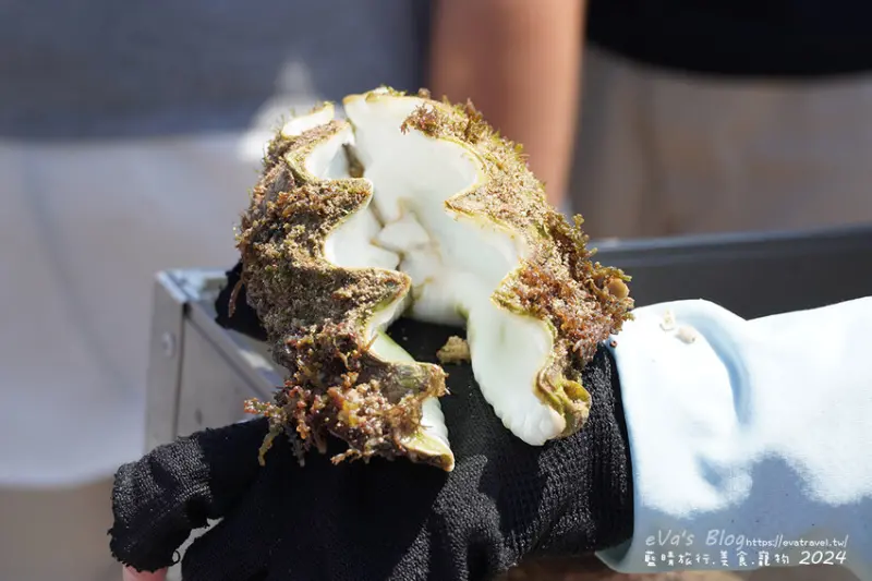 這個硨磲貝算小顆的,中間像閃電的地方是硨磲貝的肉,硨磲貝會埋在土裡,會動喔!不是不會動喔!當硨磲貝感應到有東西的時候會瞬間自己合起來,因為沒有牙齒所以是直接將殼閉上有點像河馬的概念