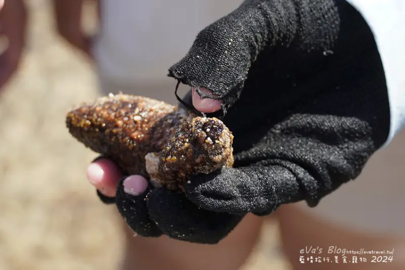潮間帶活動讓我們可以對這海裡的生物有更多的了解更多的認識,這次導覽員為我們介紹了多種顏色海膽、像海星的陽隧足、有潛水員殺手之稱的硨磲貝、像吸盤一樣的海葵、有海男人之稱的海參等等,還可以親手觸摸體驗是很特別的觸感接觸呢,呵