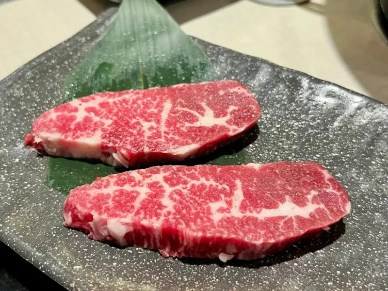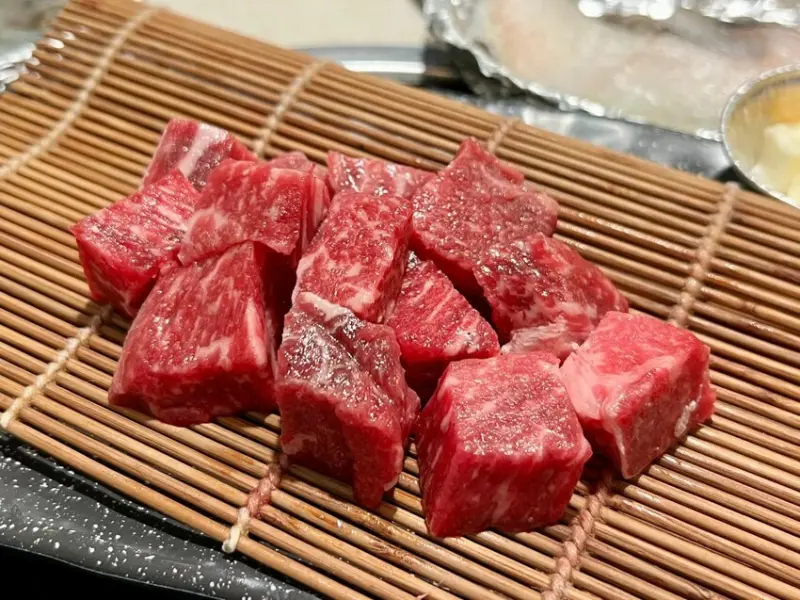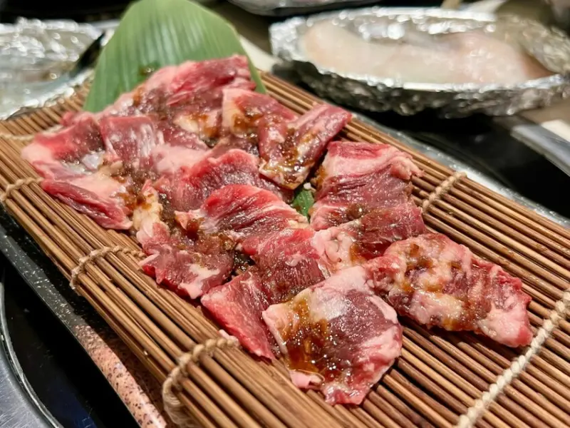 「特選牛橫隔膜」帶有獨特的嚼勁,油脂與瘦肉分佈均勻,搭配鹹甜秘醬更能突顯牛肉的鮮美,建議烤至三至五分熟,保留最佳口感。