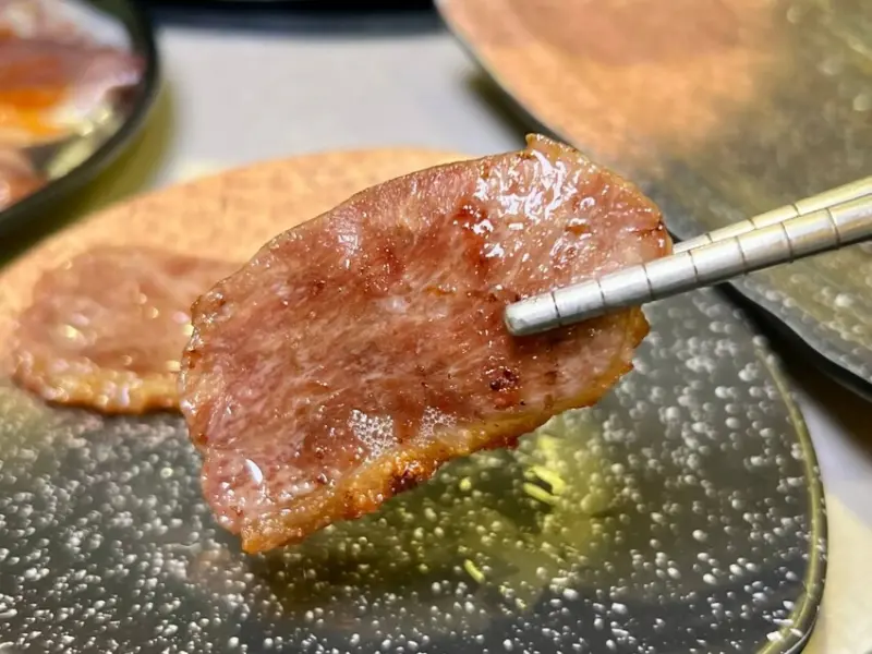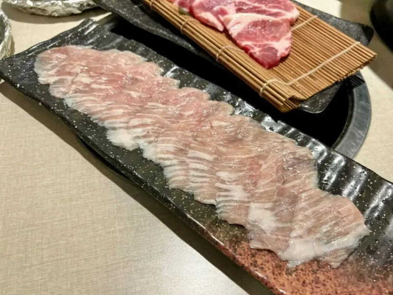 「厚切豬五花」厚切的豬五花肉質厚實且富含油脂,經過燒烤後外層微微焦脆,咬下去滿是肉汁,搭配辣味噌的醬香與微辣感,令人食慾大開。