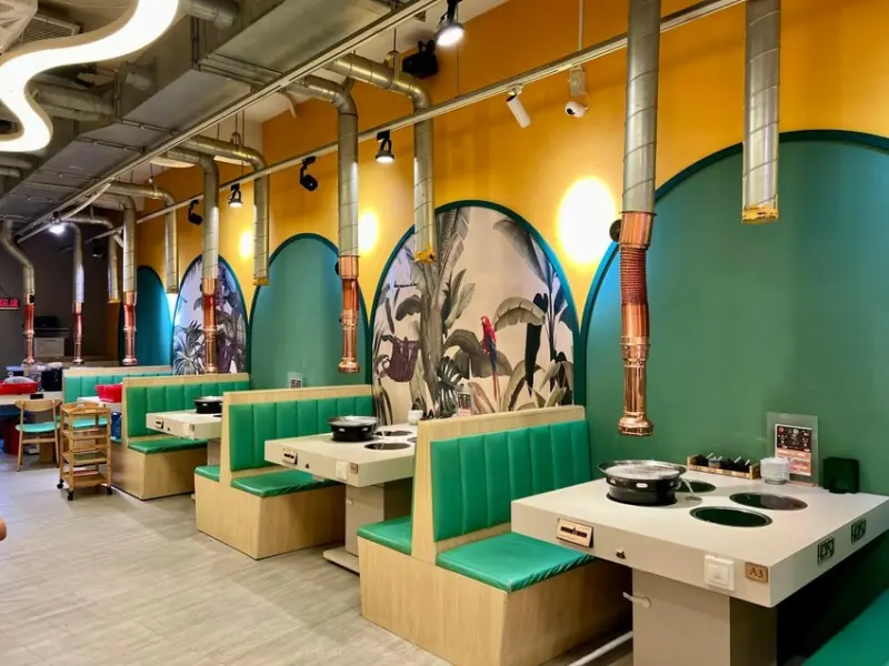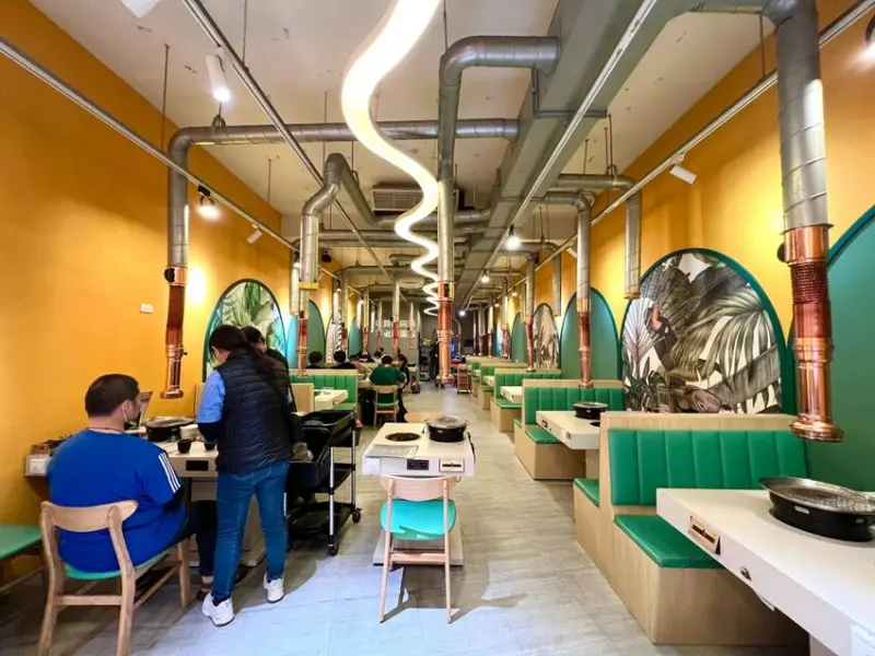 店內原本採單點制,但在老顧客的建議下,改為主打單點精緻般的火烤兩吃吃到飽。店內環境明亮,座位採小包廂式設計,最多可容納48人。