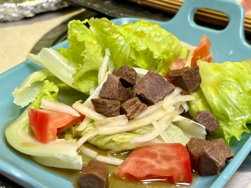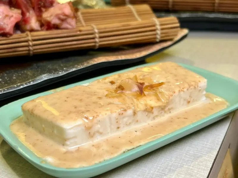 「日式胡麻豆腐沙拉」滑嫩的豆腐搭配胡麻醬,濃郁的芝麻香氣與豆腐的細緻口感完美融合,清爽解膩。