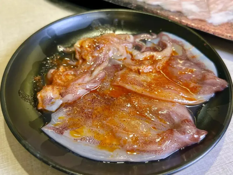 「殺好的辣味鮮小卷」小卷鮮嫩無腥味,已去除內臟,方便燒烤。微辣的醬料讓小卷的鮮甜更加明顯,相當涮嘴,也很適合在小酌時享用!