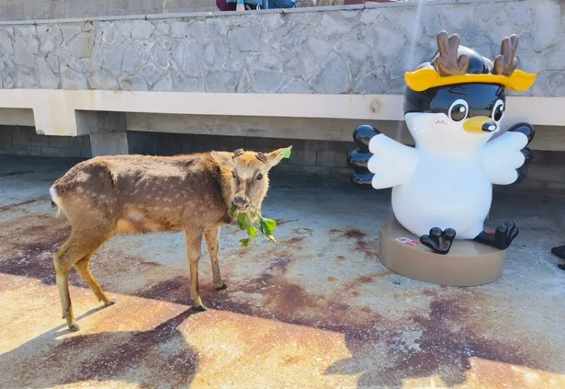 剛登島,在轉角處就看到馬祖可愛的吉祥物「鹿霸」,這是馬祖神話之鳥黑嘴端鳳頭燕鷗Q版設計,馬祖神話之鳥頭戴著大坵島獨有的梅花鹿鹿角髮箍,超級可愛的啦!