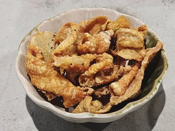 可以說是串燒之外的店家推薦料理,能夠冠上傳說中到底有多厲害,當然要點來試試!來自富良野雞的雞皮,完全沒有腥味,雞皮似乎比一般雞來的厚.炸得很透徹的雞皮酥脆如同餅乾,可是在咀嚼之中又可以感受到雞皮的韌性,好吃到我們快速地解決了又立刻點了一份!