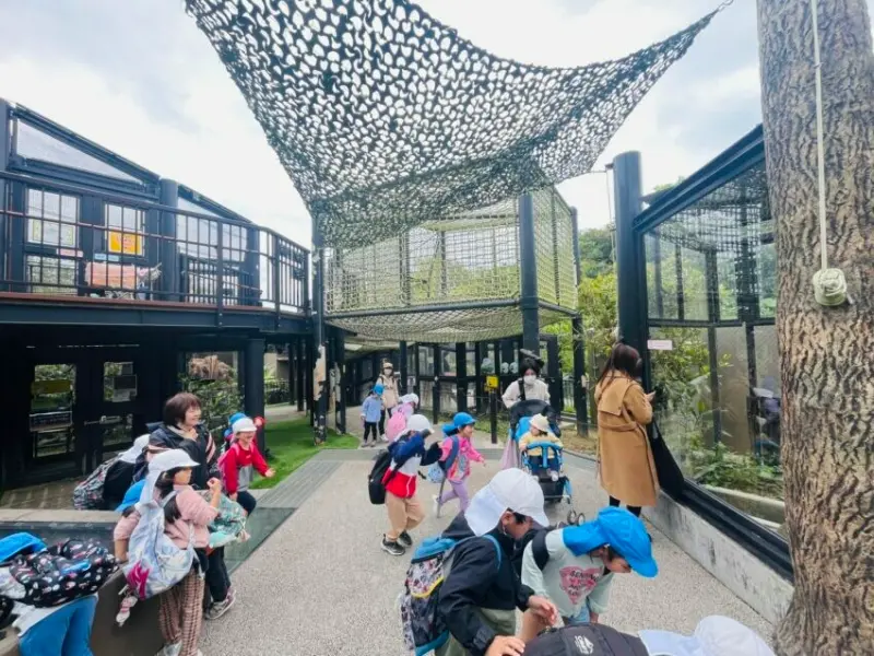里山迷宮不僅入口招牌很童趣可愛,裡面也展示許多超萌的人氣小動物,像是毛茸茸的松鼠、山貓、狐狸、狸貓,世界上最小的熊「馬來熊」以及日本黑熊也在這裡!一進來會在木棧板步道從高處觀察動物,還設置了給孩子玩耍的攀爬網。