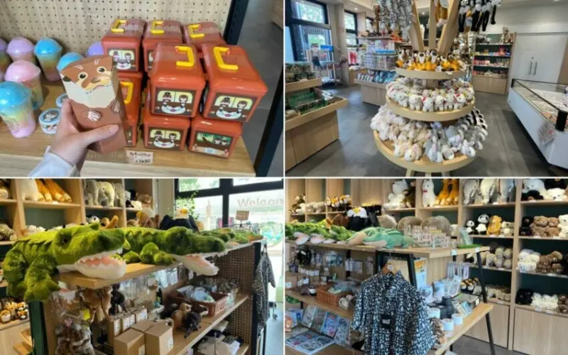沖繩兒童王國的紀念品店裡有各式各樣的動物周邊商品,商店不算很大但五臟俱全,販售的商品從各種Size的動物布偶、衣物到動物造型的餅乾零食都有,想買伴手禮可以來這裡挖寶。