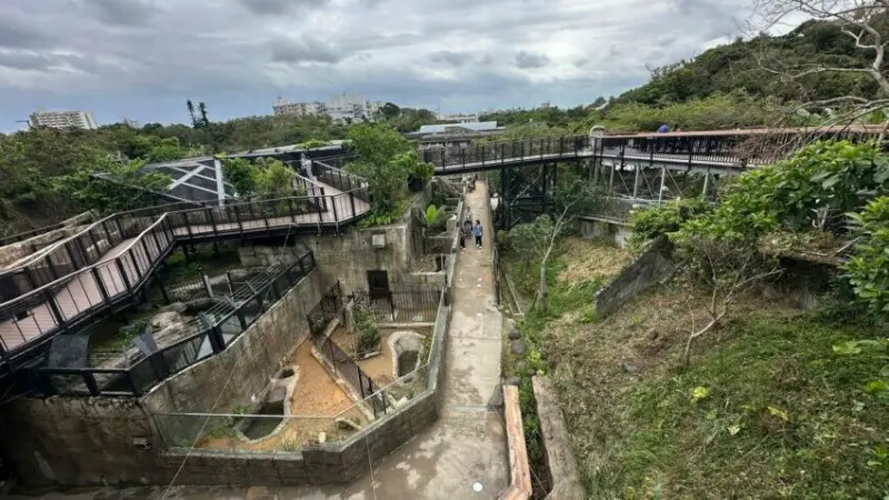 看到旋轉木馬右轉後走一小段斜坡,就到了最有在地特色的「琉球弧」!這裡飼養著包含沖繩本島、九州與台灣之間約200個大大小小的島嶼群所孕育的豐富動植物群,原生家畜、屋久島獼猴、琉球犬、大冠鷲等鳥類都在這裡。