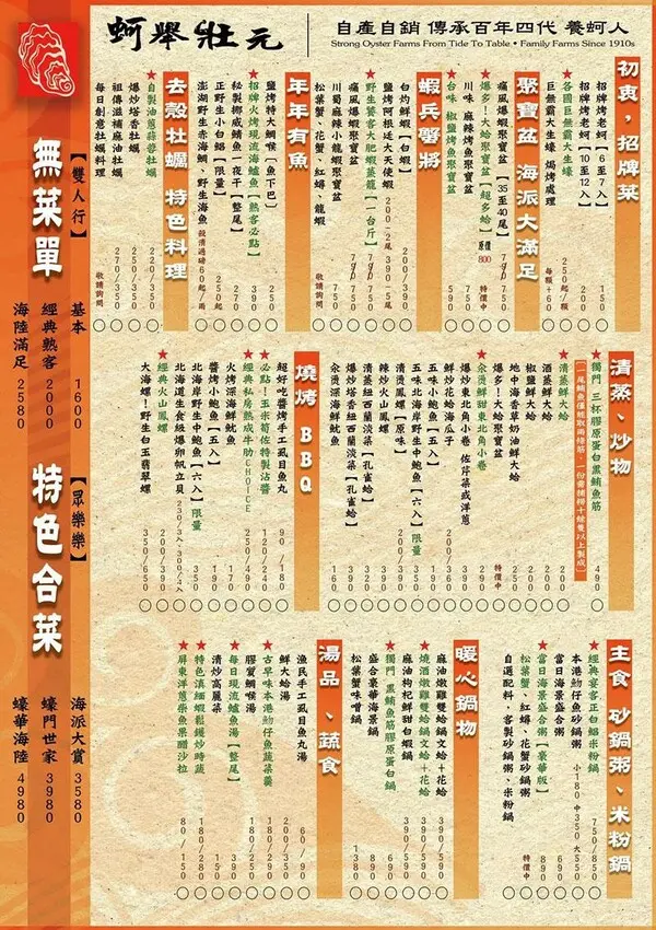 今天京少要帶大家來去新竹香山吃一家超厲害的鮮蚵料理餐廳,這家「蚵舉壯元」真的是新竹在地人的口袋名單,他們家可是傳承了百年的養蚵工夫,家族四代都是靠海吃飯的養蚵人喔。從以前在潮間帶搭木棚架開始,一步一腳印累積了對海洋的了解和敬意。來到蚵舉壯元,你就能吃到這些養蚵職人用最純粹的方式料理出來的海味,而且他們不只有琳瑯滿目的單點,還有雙人$1600起的無菜單料理和家庭合菜可以選,就是要用漁民對品質的堅持,讓你吃到尚青的海味,說到新竹吃鮮蚵,或是想找香山海鮮,這家「蚵舉壯元無菜單」絕對讓你滿意。