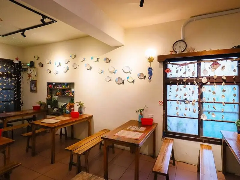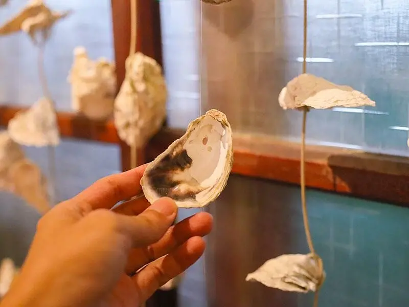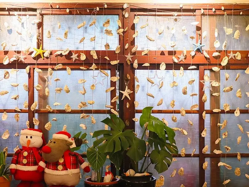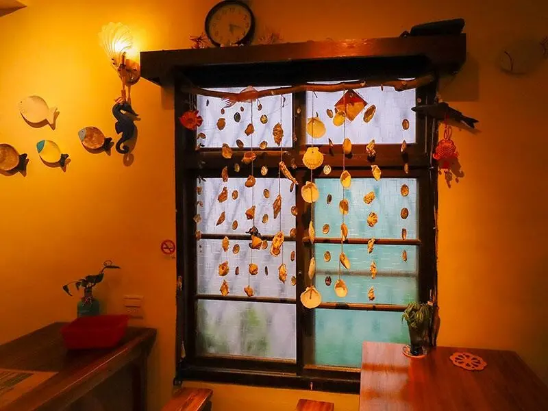現在「蚵舉壯元」已經有很寬敞的室內用餐空間了,再也不用怕在新竹吃海鮮會被風吹到頭痛啦。店裡的佈置也蠻有巧思的,木頭桌子延續了在地的感覺,牆上和窗戶上的蚵殼裝飾,真的會讓人覺得好像來到潮間帶一樣,可以體驗養蚵人的生活,吃美食還可以長知識呢。