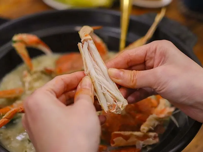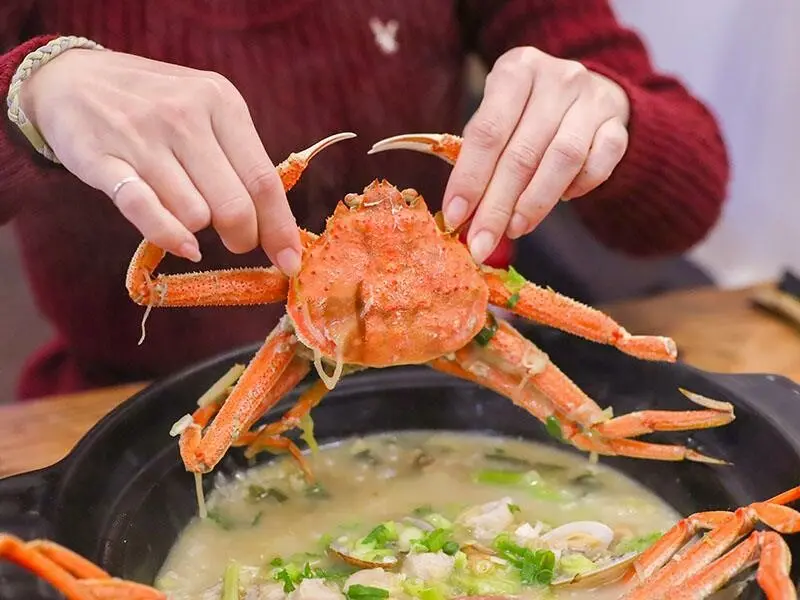 這個海景粥是遵循古法用白米慢慢熬煮的,裡面加入了海帶芽和其他海鮮湯底一起熬製,再放進每天現撈的漁獲,讓整鍋粥充滿濃濃的海味。現在只要加價$390,還可以再多兩隻北海道的松葉蟹來增加風味,濃郁的蟹香和米粥融合在一起,就像把整片大海的精華都濃縮到這一鍋粥裡面了。