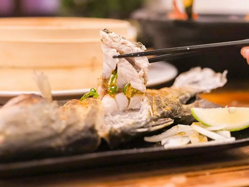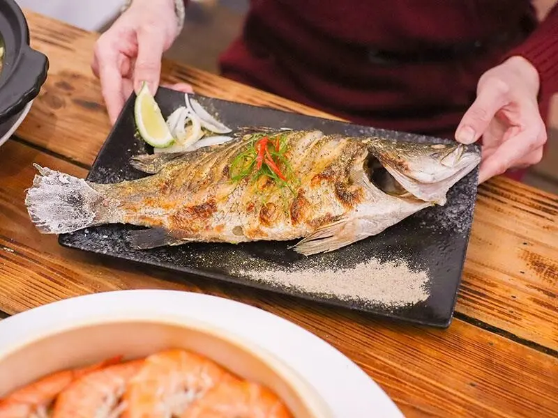 原本是魚下巴,只要加140元就可以升級成烤海鱸魚喔。海鱸魚的肉質比鯛魚更細緻,外皮烤到焦香酥脆,裡面卻還是鮮嫩多汁,完全沒有土味,只有滿滿的魚肉香氣,這就是最新鮮的魚和最純粹的炭火香氣交織出來的簡單美味。
