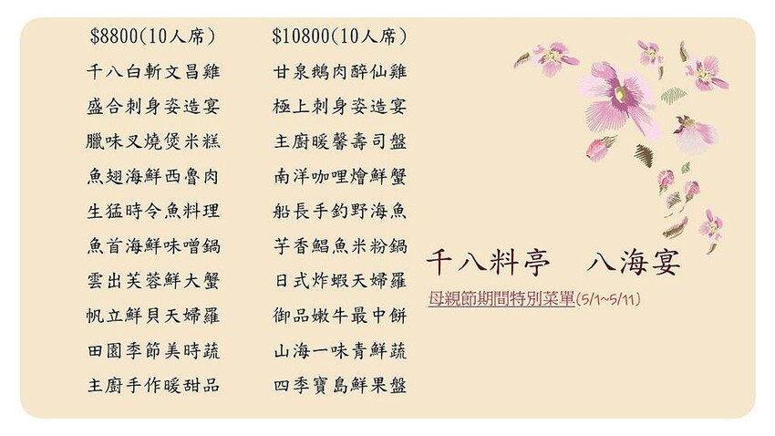 想帶媽媽吃海鮮大餐,第一個想到的就是南寮的「千八料亭八海宴」啦!水族箱裡的生猛海鮮新鮮看得見,想吃帝王蟹這種比較特別的海味,也可以提前預約喔!他們也可以依照你的預算來搭配菜色,現場也有母親節桌菜的菜單可以選擇,最重要的是食材新鮮,吃得開心最重要啦!讓幸福的滋味,也能很單純地呈現出來。