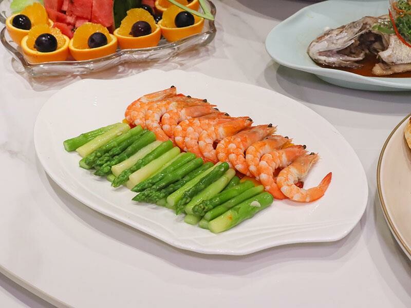 當然也要來點清爽的蔬菜,這道山海一味青鮮蔬,時蔬搭配的是水族箱裡現撈的沙蝦,跟蘆筍一起炒,吃起來清爽又不油膩,完全展現了菜名的「山海一味青」的感覺。