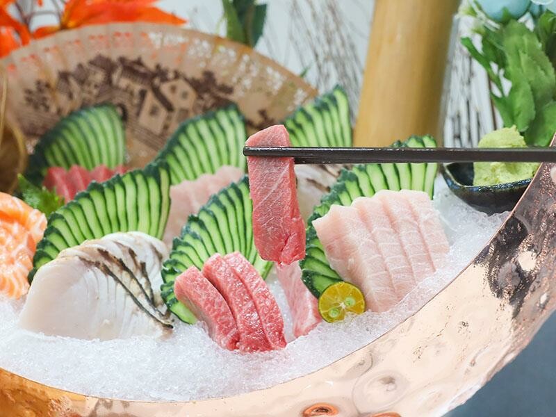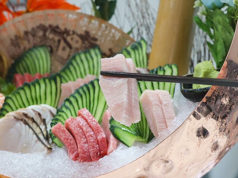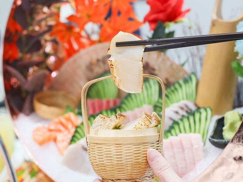 接著是他們家的重頭戲——極上刺身姿造宴!看起來超級華麗的!今天我們吃到的是炙燒干貝、鮭魚、東港黑鮪魚、白金旗魚、土魠魚等等。黑鮪魚的油花分布就像大理石一樣漂亮又均勻,吃起來鮮甜到不行!炙燒干貝外面稍微烤過,裡面還是軟嫩的,帶著大海的鮮味,而且切得超大片!鮭魚肉質很細膩,白旗魚因為少了筋膜感,所以油花吃起來更明顯,土魠魚的炙燒香氣也很特別,每一種生魚片都有不同的鮮味體驗。白旗魚的肉質少了筋膜感,讓油脂和肉質更能體現。