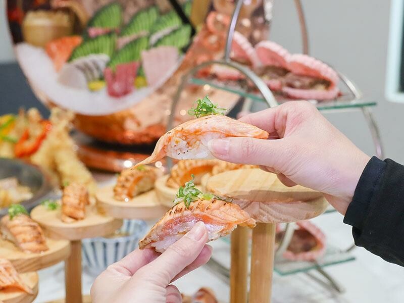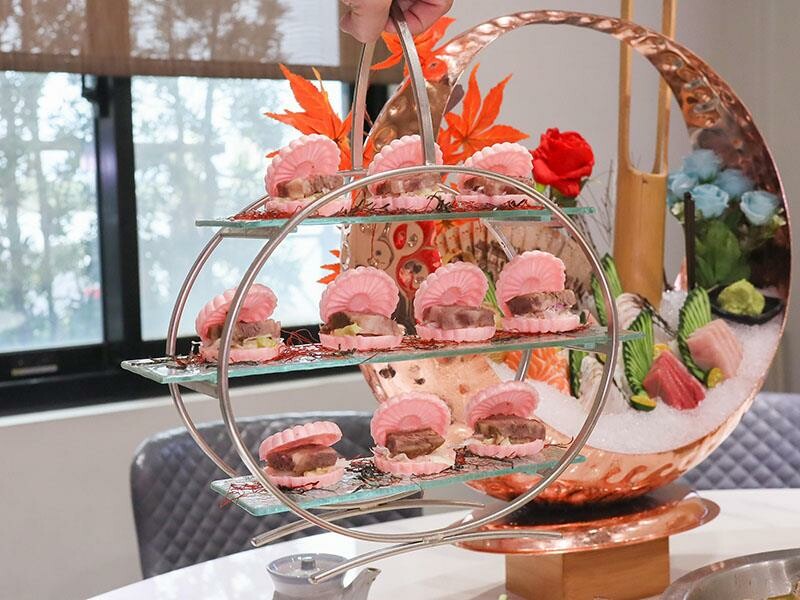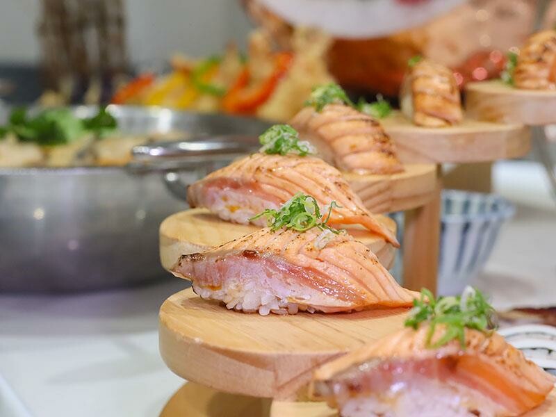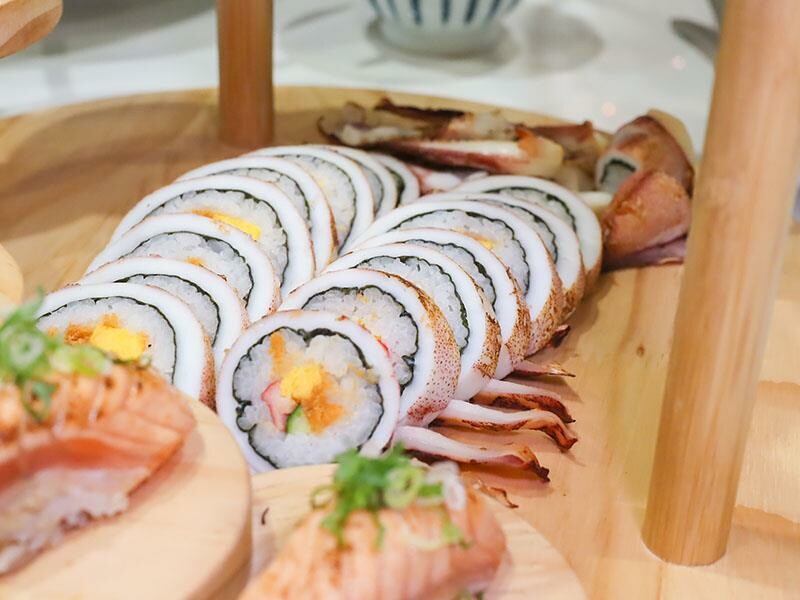 再來是主廚暖馨壽司盤,炙燒鮭魚握壽司的油脂在火烤之下微微融化,入口即化,搭配酸酸甜甜的醋飯剛剛好。中卷壽司也很特別,主廚很用心地把中卷包壽司切片,吃起來Q彈有嚼勁。