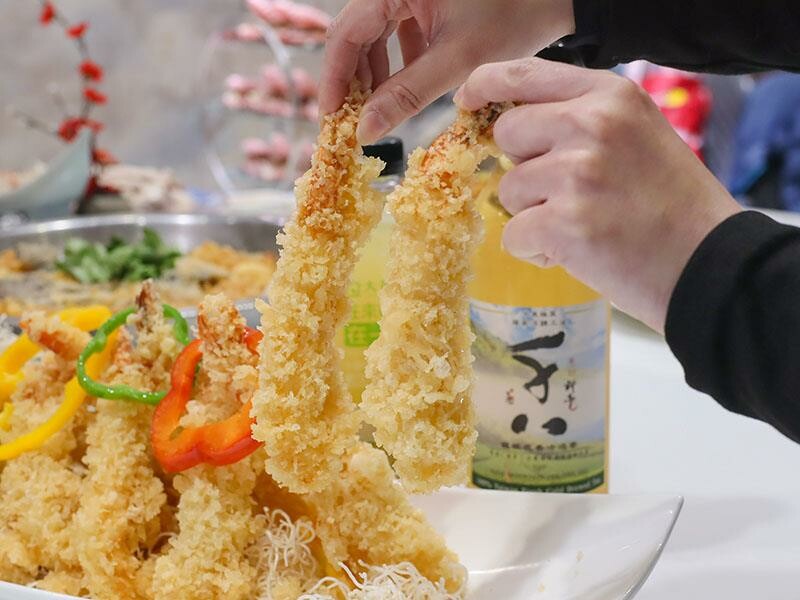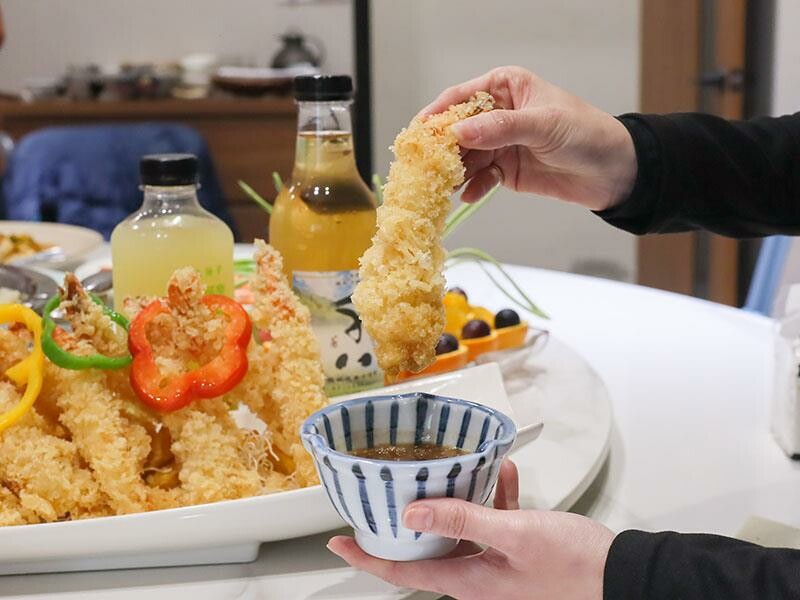 小朋友最愛的日式炸蝦天婦羅,是用新鮮的大蝦裹上薄薄的麵糊油炸的,外皮酥脆,裡面的蝦肉卻很嫩,而且麵衣很薄,蝦肉的比例很高,吃起來飽滿又彈牙。