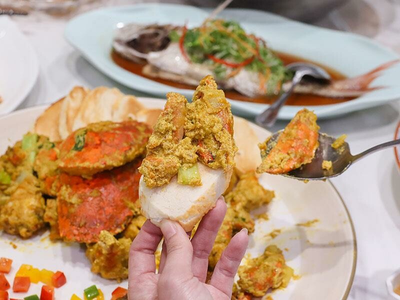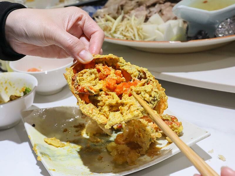 這道南洋咖哩繪鮮蟹,咖哩醬的味道超濃郁香醇,帶點微微的辛辣跟甜味,螃蟹肉質細緻又多汁,每一口都吃得到滿滿的蟹肉,蟹殼上的蟹黃蟹膏也是超豐富的!記得要用附上的軟法麵包沾著咖哩醬吃,保證讓你把每一滴美味都吃光光。