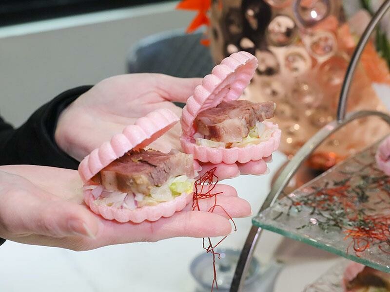 這個御品嫩牛最中餅,用甜點的包裝結合了嫩煎牛肉,裡面還搭配了洋蔥跟生菜,牛肉的嫩度在最中餅的襯托下更明顯,甜鹹交織的口感真的很讓人驚艷。