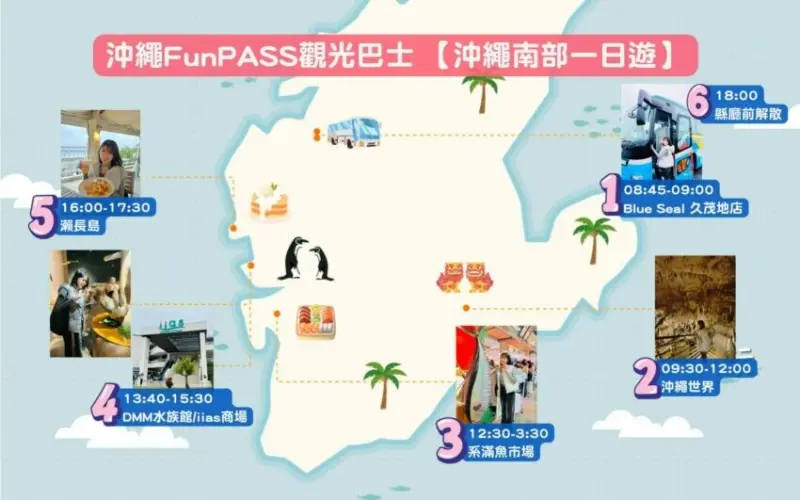 這趟搭乘的是的「沖繩南部一日遊路線」,都是沖繩南部熱門景點:沖繩世界、DMM水族館、瀨長島,沿途經過系滿魚市場進去用餐,環境乾淨食物好吃也不貴,最後晚上我們選擇在瀨長島慢慢逛,就不跟車返回國際通了!