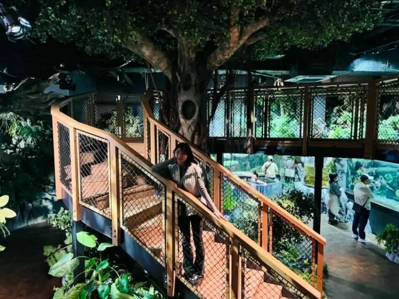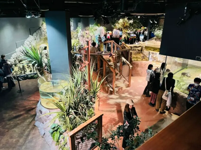 走進2樓入口,映入眼簾的是山原森林區,這裡以沖繩秘境「山原」森林為靈感規劃空間,展示青蛙、變色龍等雨林動物!