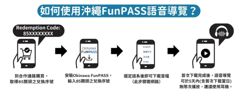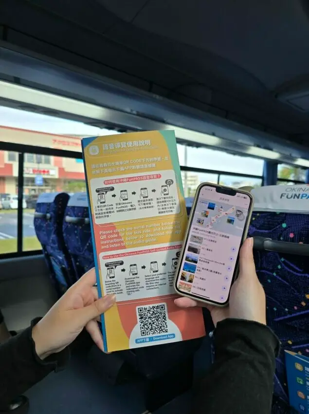 有的!沖繩FunPASS觀光巴士車上也有多語系的語音導覽操作說明,只要透過手機掃描QRCODE登錄訂單序號即可使用車上語音導覽。
