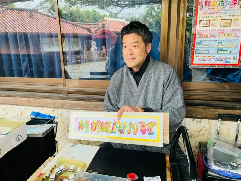 字畫藝術師幫我們寫了「好好玩FUNIT」,超厲害的,字畫師將象徵沖繩的各種植物、動物、花卉全都融入在字畫上,非常的用心,很推薦來到沖繩世界文化王國,可以體驗一下字畫藝術,帶一幅回家留下美好回憶!