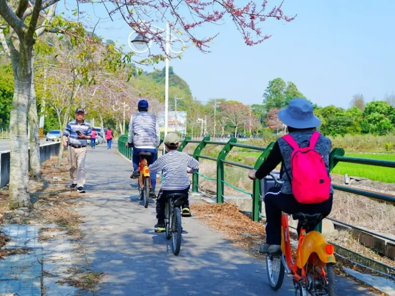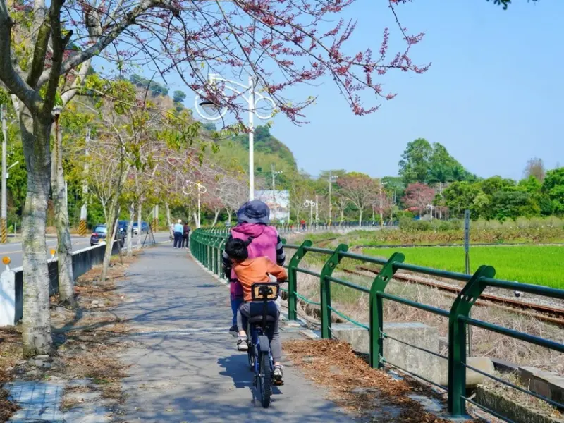 雖然現在還不是花旗木的盛開季節,但假日來這裡的人還是很多,尤其是騎腳踏車的遊客特別多!沿著鐵道慢慢騎,邊欣賞初開的花旗木,邊感受微風吹拂,真的很愜意~等到花旗木滿開時,整條步道變成粉色隧道,騎在其中一定更浪漫。