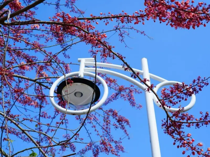 這裡的路燈設計成腳踏車的造型,真的很特別,也讓整個環境更有特色!走在步道上,看到這些造型路燈,會讓人更有想騎腳踏車遊覽的衝動。搭配周圍的花旗木和鐵道風景,整體氛圍真的很棒,來這裡不僅能賞花,還能感受濃濃的鐵道小鎮風情!