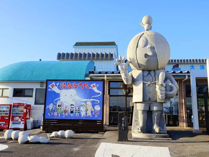 中浦大漁市場門口有7.7公尺高的鬼太郎大石像超好認,市場內販售新鮮的山陰漁貨,新鮮松葉蟹、魚類、魚乾等海產,還有鳥取縣的特產及甜點等超好買,一旁還有著名的美食餐廳,可當中途中繼站買好買滿,也可以享用到美味的松葉蟹套餐,來到境港必來的景點~~