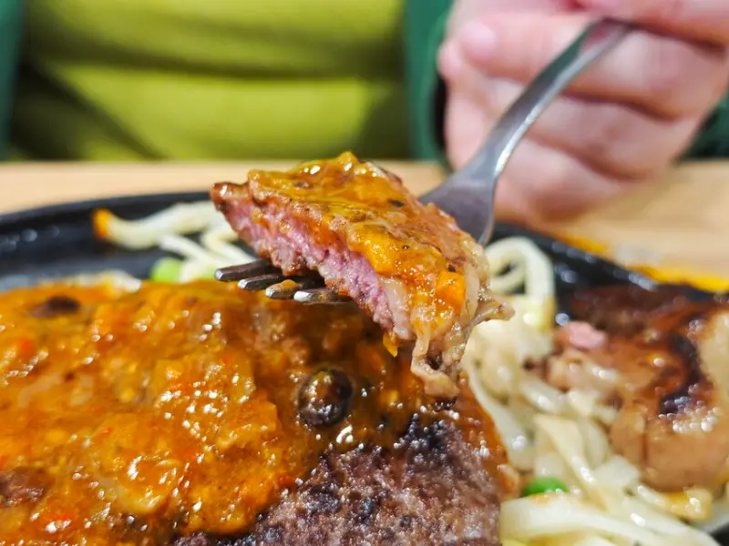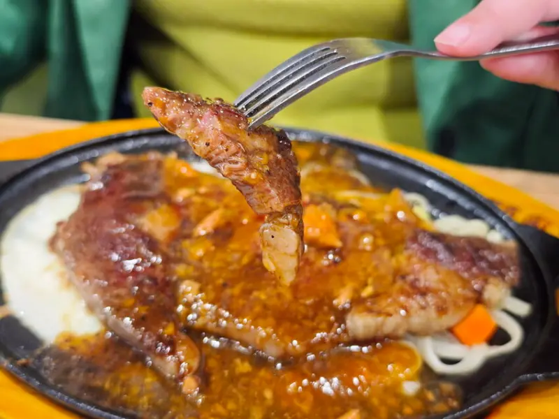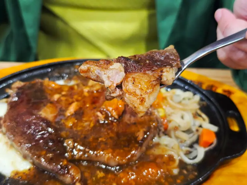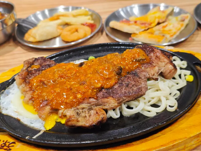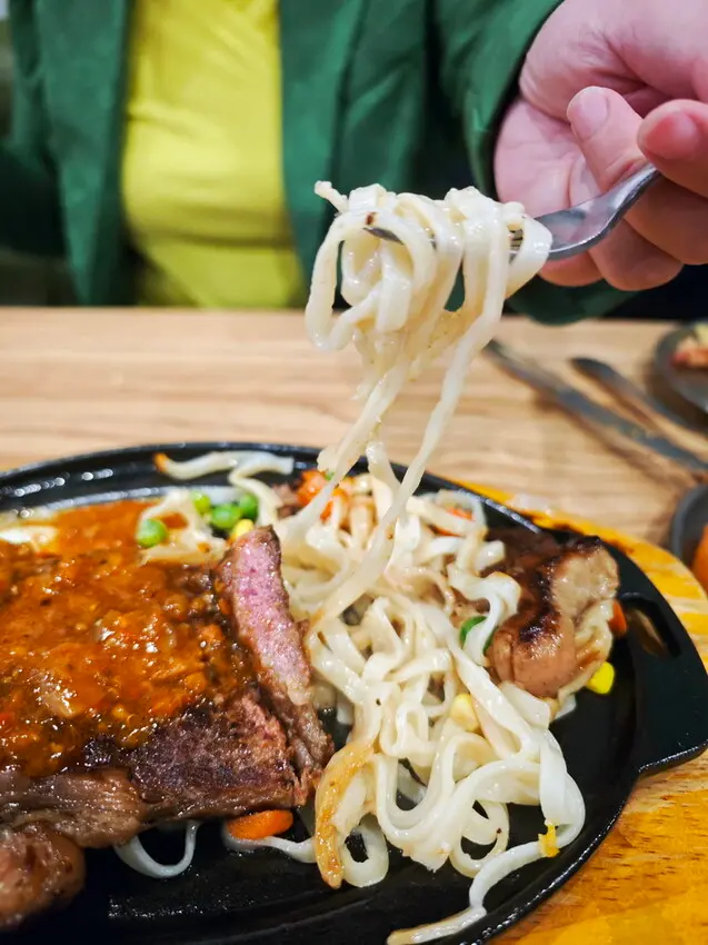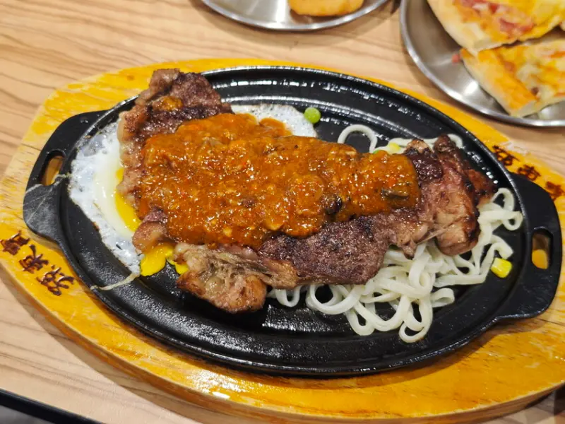麻辣蘑菇醬,讓牛排吃起來更帶勁,配上蛋、鐵板麵,超滿足。