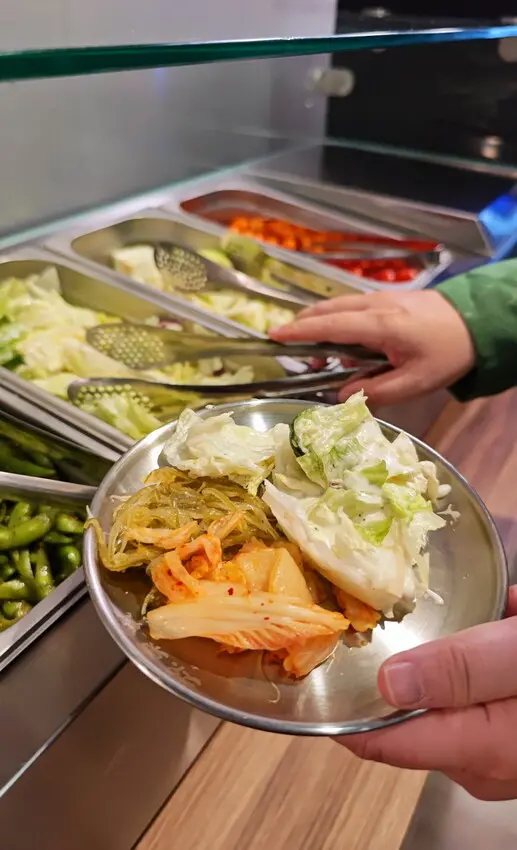 有生菜沙拉、毛豆、韓式泡菜、黃金海帶絲。