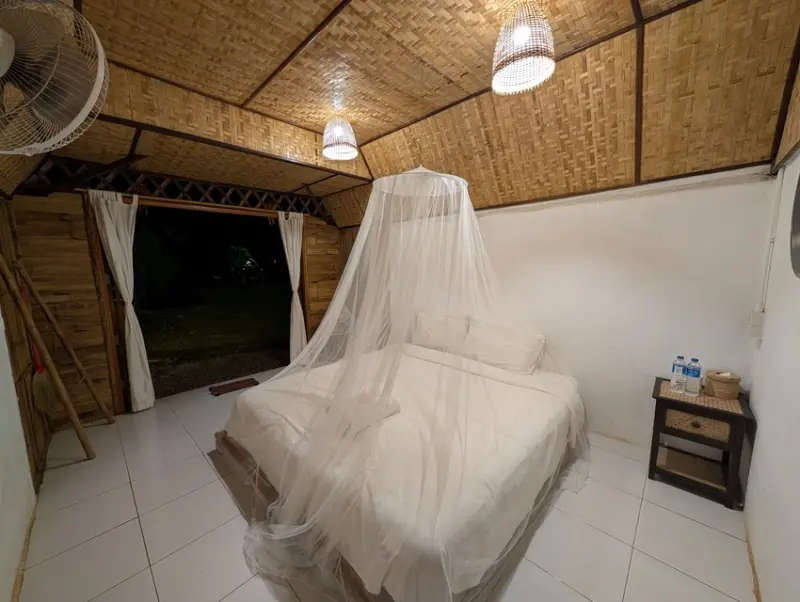 第一次看到洗澡水是透過竹筒導引流下,床鋪上方有掛蚊帳(要睡覺時可以放下來)