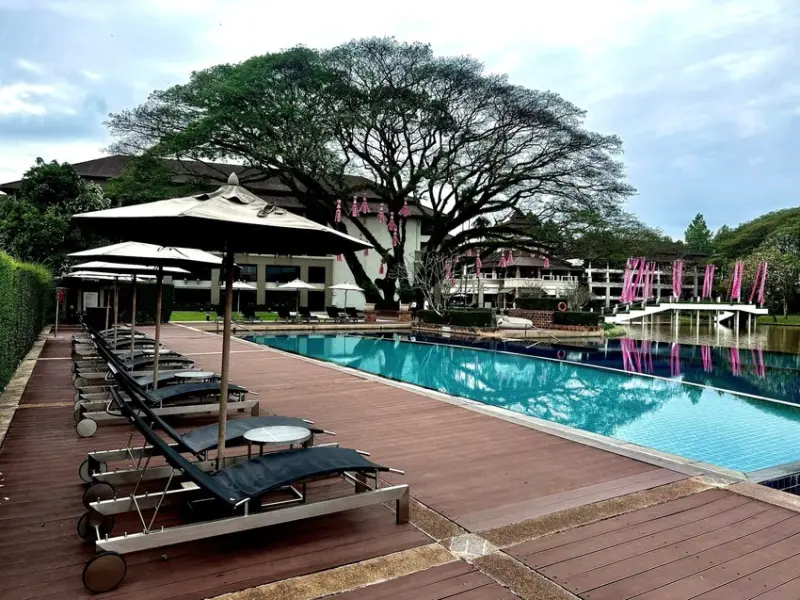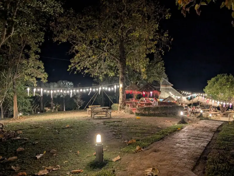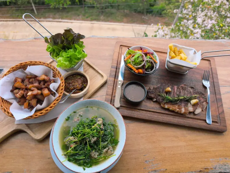 晚餐就在園區內的一處開放大廳,吃著在山腳下跟攤販買的烤肉、Pha Thai以及跟園區點的鳳梨腰果炒飯