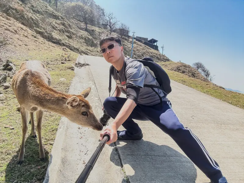 ▲與大坵島梅花鹿自拍 這些鹿群大多在島上自然繁殖,性格溫和,與遊客互動已成為島嶼日常風景。