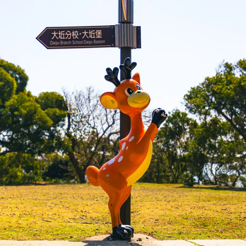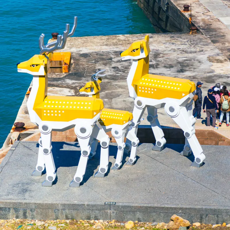 ▲大坵島黃色機器鹿裝置 這些鹿群大多在島上自然繁殖,性格溫和,與遊客互動已成為島嶼日常風景。