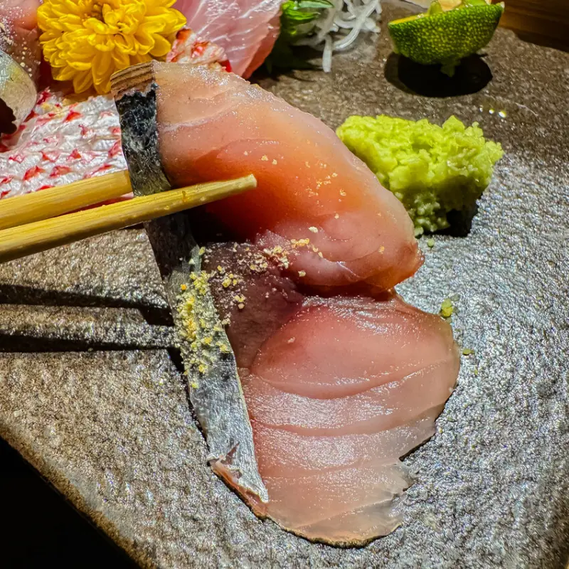 魚片切得非常薄,幾乎是半透明的,一看就知道魚肉很新鮮。粉紅色和白色交錯的花紋,加上天然的紅色條紋,簡直就像藝術品一樣。鯖魚的味道非常濃郁,而且帶有獨特的油香味。一放進嘴裡,鮮甜的味道馬上散開,油脂的滑順感更是讓人覺得超滿足。特別推薦可以沾一點點醬油和芥末一起吃喔。如果你喜歡吃重口味或是油脂豐富的魚種,那這道鯖魚生魚片你絕對不能錯過。