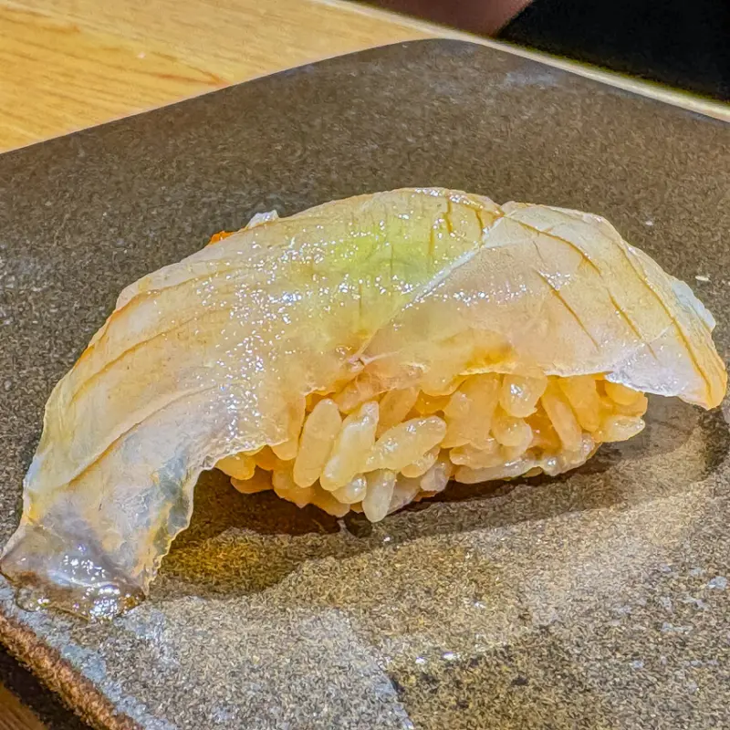 龍鮎 70元顏色看起來晶瑩剔透,質感很細緻也很高級。 龍占魚片切得很薄,像輕紗一樣,蓋在醋飯上面,帶有自然的油光。魚片的顏色很淡雅,還帶有一點點透明感,讓人想到清澈的海水。龍占魚的肉質很細膩又很柔軟,幾乎是入口即化。魚肉的油脂感剛剛好,散發出淡淡的海味和鮮甜,跟醋飯的味道完全融合在一起。這道壽司很適合喜歡清淡口感的客人。魚肉的細膩度和油脂的滑順感,讓這道料理變得很高雅又美味。![]()