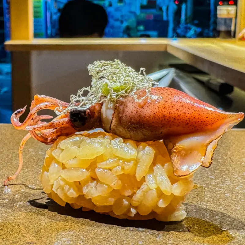 螢烏賊壽司 60元這個螢烏賊壽司因為它獨特的外觀和口感,吸引了很多喜歡嘗鮮的客人。 烏賊的身體完整地放在醋飯上面,頭部朝外,觸鬚自然垂下來,就像一個精緻的藝術品。上面還點綴了昆布絲和蔥花,增加了視覺上的層次感。 螢烏賊的口感很有彈性而且味道很濃郁,帶有微微的鹹味和鮮甜感。加上昆布絲的風味融合進去之後,讓整體的鮮味更上一層樓。 這道壽司很適合喜歡嘗試新奇口感的人。螢烏賊獨特的風味和飽滿的口感,會讓人印象深刻喔。![]()