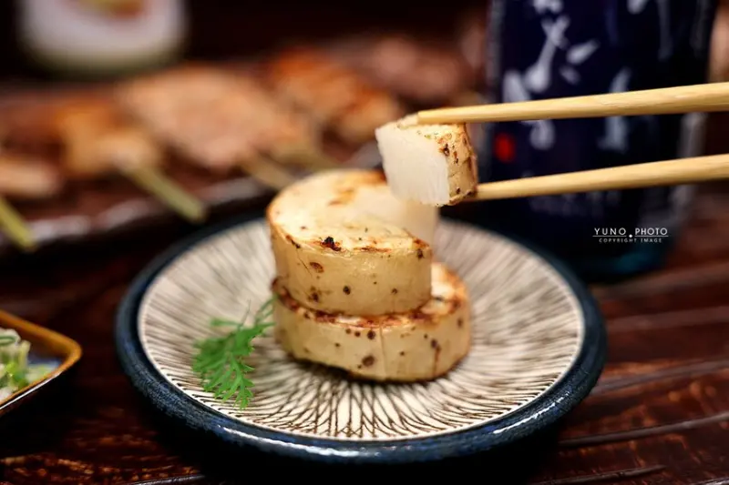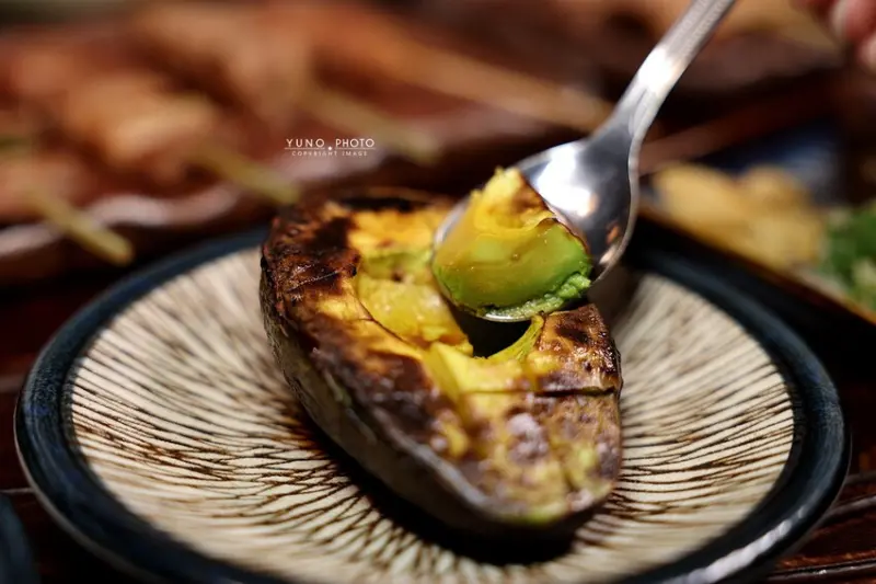生食鮭魚(約三分熟)輕輕炙燒後香氣十足,鮭魚油脂微融,口感滑順!日本山藥烤過後還是保有脆感,口感清新又爽口!竟然還有烤酪梨!炭香跟酪梨奶滑的口感mix在一起,意外地好吃!