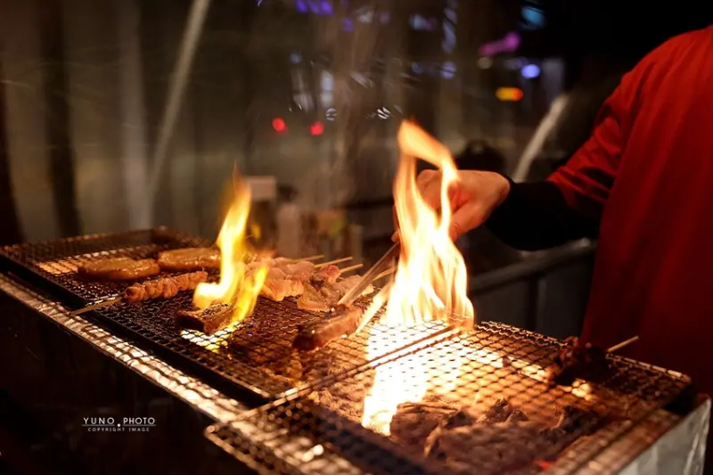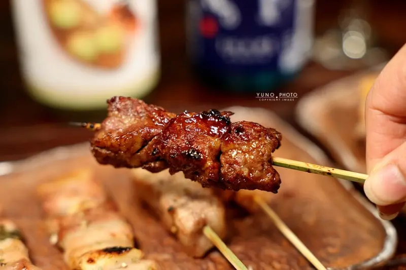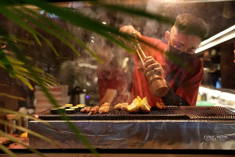 而且他們還有玻璃半開放式的廚房設計,你可以直接看到職人專心在炭火烤台上烤肉,那使用的可是「備長炭」,能夠釋放出高溫,把肉的原味跟焦香味都逼出來,每一串串燒都在火光跟煙霧中舞動,每一口都像在聽舌尖打鼓一樣精彩!
