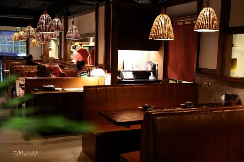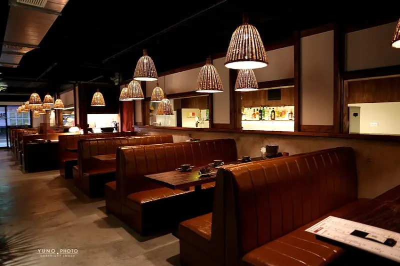 走進「打鼓的舌炭火酒場」,真的會瞬間覺得像是踏入了東京某個小巷裡的老店!整體空間是以深色木作加上溫暖的黃光為基調,搭配復古的皮質卡座跟低調的竹編吊燈,整個氣氛溫馨又不拘束,一踏進來就有置身日本居酒屋的錯覺!