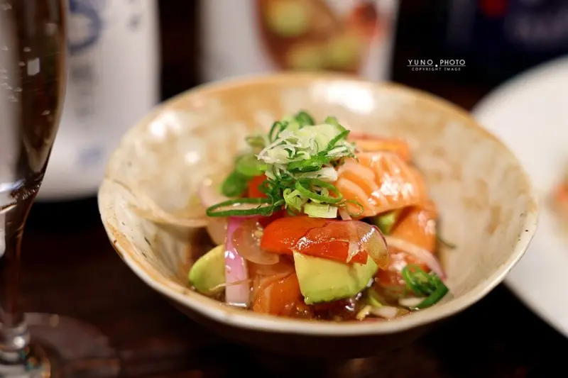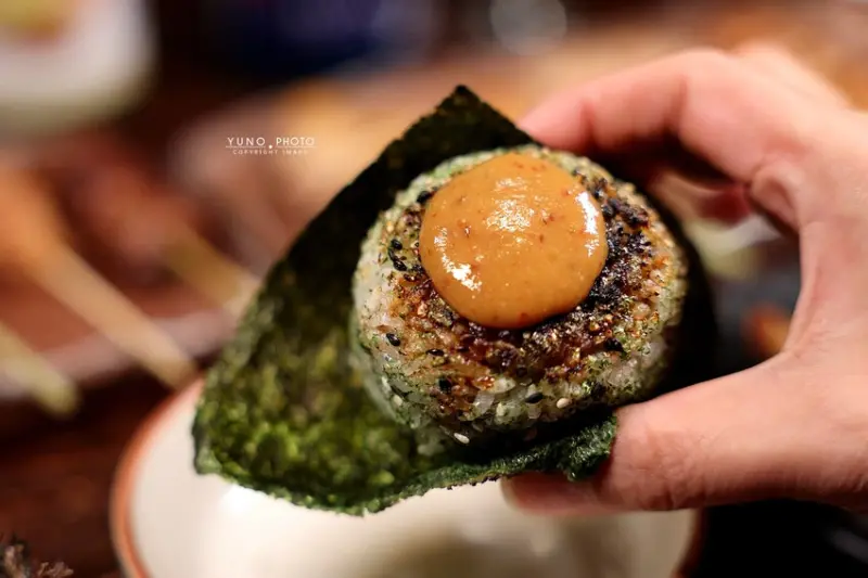 除了串燒,他們還有生食鮭魚與酪梨這個入口即化的濃厚系組合,冰冰涼涼很適合當前菜!辣味噌烤飯糰外皮脆脆的,裡面軟糯,夾層還包了柴魚絲,香氣整個炸開,想吃飽一點點這個準沒錯!