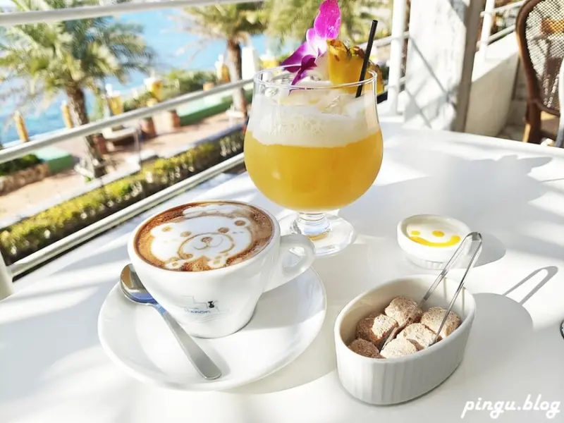 Seaside Cafe Hanon看出去就是美麗的海景,在如此美麗的景色下吃後鬆餅及飲品,真的是一大享受啊!咖啡還拉出可愛的熊熊,心情都跟著愉悅了起來~