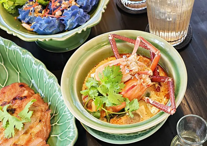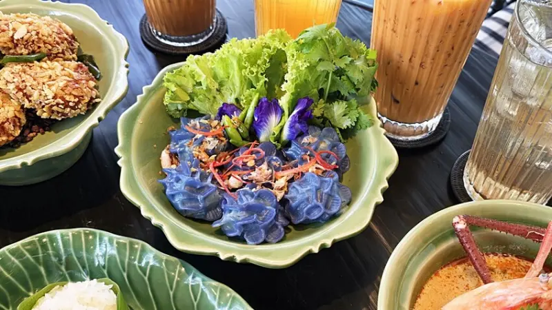 花汁蟹肉蒸餃是Erawan Tea Room的招牌料理,有著藍紫色的夢幻外皮是以蝶豆花染成的,並捏成花瓣般的外型、內餡是包覆滿滿的蟹肉、可說是相當吸睛!!吃起來的口感;比較像似燒賣般的紮實,因為飽滿的肉餡又多汁且夠味,很推薦大家一定要嚐嚐!