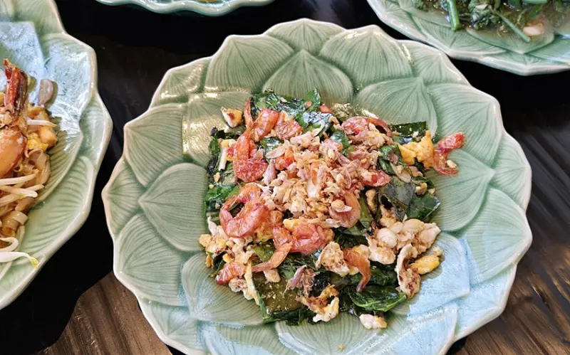 良叶炒蝦米這一道在台灣可是吃不到,所以有來Erawan Tea Room一定要試試。這是以夜來香花快炒雞蛋、蝦米以及蒜頭,吃起來的味道很特別喔!