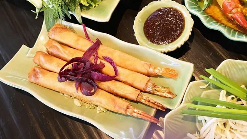 泰式大蝦春捲也是我的愛!這可是一整尾大蝦以春捲皮包裹在下去油炸,吃起來相當酥脆且蝦肉彈牙令人著迷,好啦!我本身都覺得Erawan Tea Room的調味很適合我,所以基本上我在吃每一道都不想再去沾醬XD