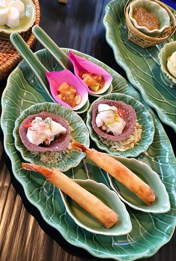 油炸大蝦春捲(梅子醬),柚子沙拉搭上酥脆的餅乾、蓮花瓣內的沙拉系列超爽口!