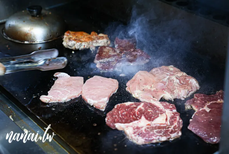 肉品是採用新鮮原肉,每一塊都是現點現煎,給得份量塊頭不小,看著肉品在高溫鐵盤滋滋作響,那個香氣讓人忍不住口水直流,實在有夠邪惡。