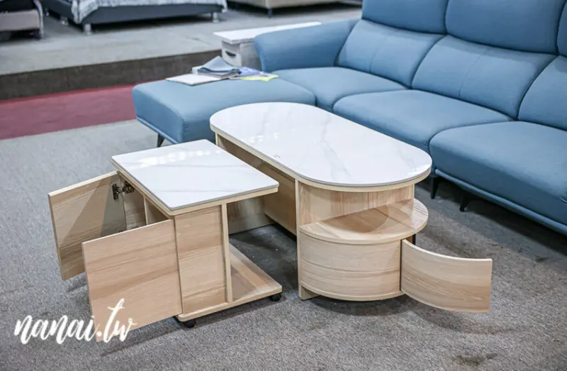 我還挖到這組橢圓形茶几。木紋色搭配白色大理石紋面,更特別是椅子拉出來秒變茶几,底下還有收納空間,根本是小坪數救星。
